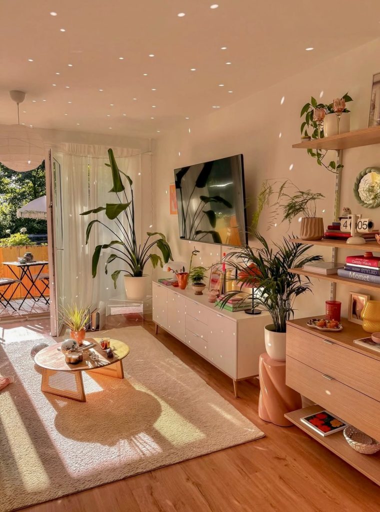This bright living room captures the essence of modern comfort with clean lines, natural wood, and playful sunlight reflections across the walls. The floating shelves and mid-century touches keep the space visually open, making it ideal for designs in small spaces where every inch counts. Pops of greenery offer subtle warm colors, softening the white backdrop without overwhelming the eye. The open doorway to an outdoor seating area adds an airy, relaxed feeling often seen in trending apartment aesthetic posts. Overall, this room blends simplicity, light, and personal touches to create a space that feels both stylish and genuinely warm.