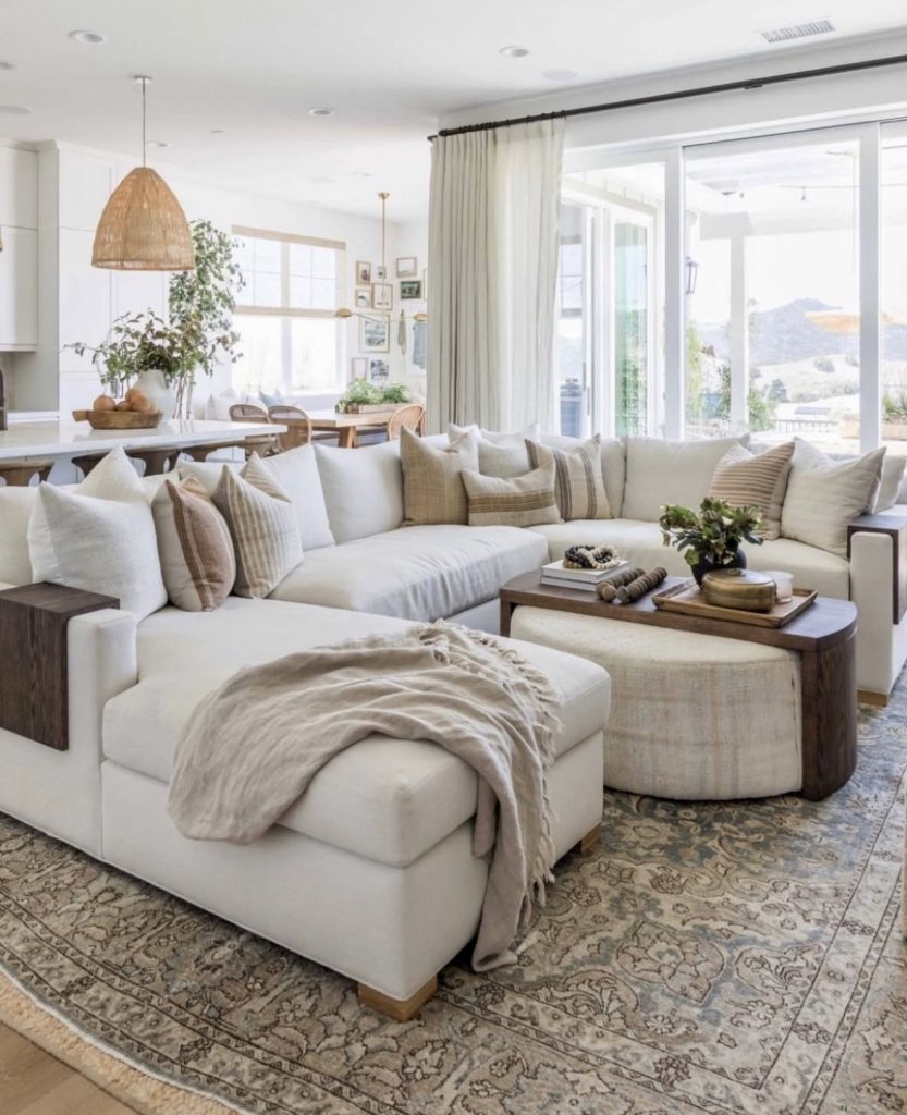 This living room beautifully blends openness with comfort, using soft neutral tones and layered fabrics to create a calm, welcoming atmosphere. The large windows bring in generous natural light, offering subtle lighting ideas for homeowners who want to brighten their space without relying on overhead fixtures. A curved sectional keeps the room feeling comfy while still maintaining a clean, modern profile that suits both family homes and apartment layouts. The combination of woven textures and warm wood accents adds an earthy charm that feels timeless for 2026. Altogether, the room strikes a balance between elegance and approachability, offering gentle inspiration for anyone seeking relaxed sophistication.