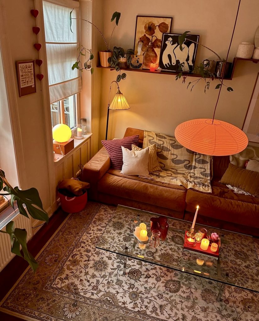 This room leans into a cozy, moody aesthetic with warm lighting, countless candles, and curated shelf décor that feels heartfelt and personal. The amber tones across the sofa and lampshades introduce subtle warm color palettes that instantly soften the room. The patterned rug anchors the space, showing how traditional motifs can feel fresh when paired with modern shapes and eclectic artwork. Even in small apartment spaces, this approach works well by keeping the seating compact while letting the décor bring in visual richness. It’s a space that celebrates personality over perfection, giving plenty of inspo for those who love intimate, low-light interiors.