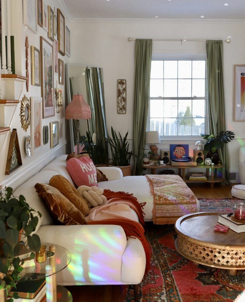 This design embraces a cheerful, layered energy with bold artwork, textured pillows, and vintage-inspired pieces that feel both curated and comfortable. The colorful rug introduces a boho touch, perfect for those who enjoy mixing patterns and colors without fear. Despite its lively décor, the room maintains a warm interior design foundation thanks to soft seating, draped throws, and a gentle mix of earthy tones. The gallery wall pulls the eye upward, which is a clever tactic for designing small spaces, helping the room feel taller and more spacious. Overall, it offers joyful design inspiration for anyone wanting a cozy room with character and color.