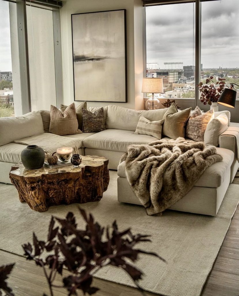 This modern space pairs floor-to-ceiling windows with a plush sectional, creating a sanctuary that feels at peace, even with an urban backdrop. The muted palette is minimal, but the expensive-looking texture of the faux fur throw adds a layer of practicality and warmth. A sculptural wood coffee table adds a strong earthy element to ground the room with warmth. The soft glow from table lamps provides excellent apartment inspo to those wanting to recreate this gentle ambiance. Overall, this modern design is a perfect combination of city living with coziness, understatement, and comfort.