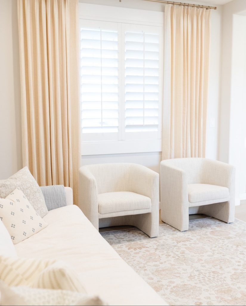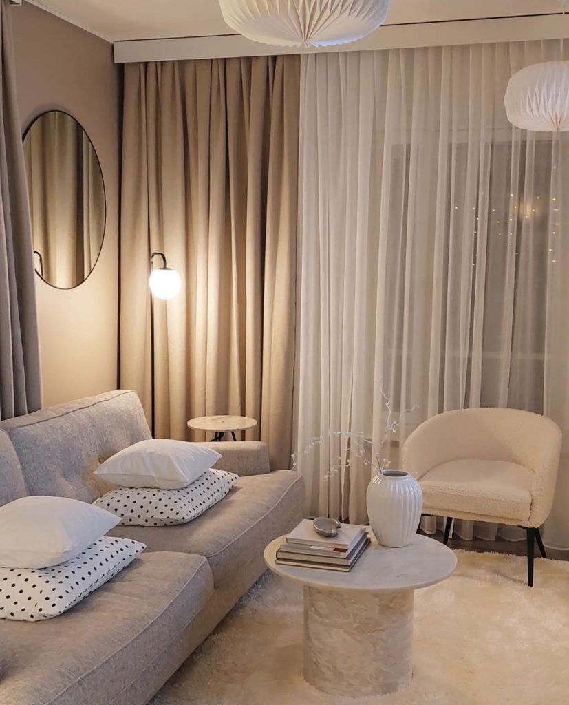 This space embodies understated luxury through its airy beige linen curtains that softly filter daylight. The neutral colors highlight a serene modern aesthetic, while the matte black curtain rod adds a refined, stylish contrast. The look feels effortlessly warm—perfect for smaller living rooms that crave openness without sacrificing texture. Designers in 2026 recommend this timeless palette for anyone seeking a cream-toned interior that stays fresh across seasons. The balance between simplicity and comfort makes this design feel like calm sophistication redefined.