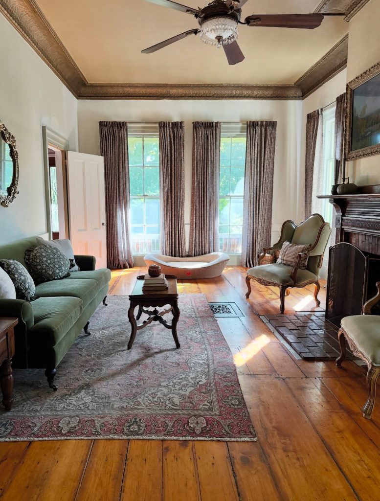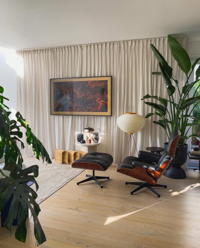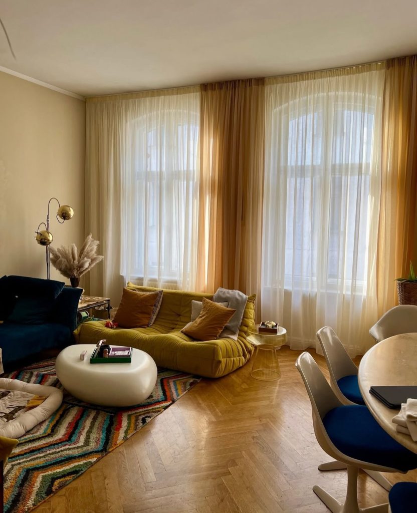 This inviting space celebrates colorful design with yellow and cream layered curtains that filter golden light across the room. Paired with a rustic wooden floor and eclectic furniture, it channels a playful yet curated aesthetic. The soft flow of long sheers brings movement, ideal for those inspired by 1970s interiors reimagined through a modern lens. As one 2026 trend, warm, optimistic hues continue to return—inviting joy and personality back into the home.