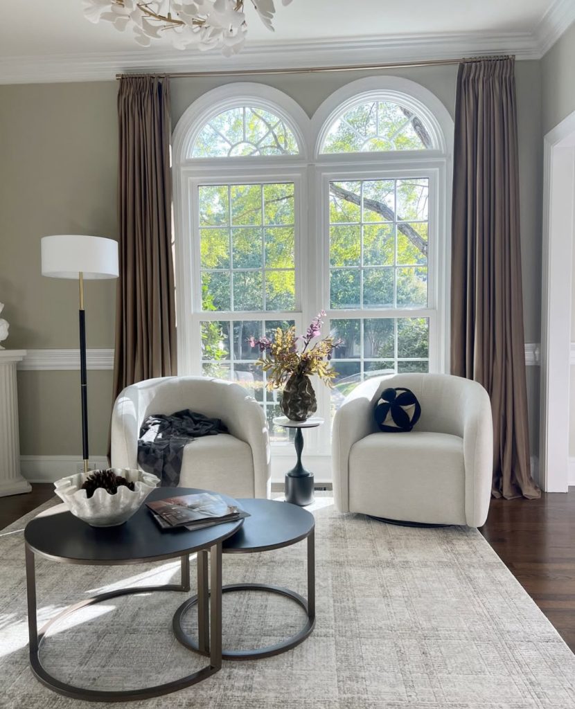 This luxurious living room reflects the 2026 trend where designers prioritize calm elegance in their interior designs. Beige curtains adorn the massive bay window, matching other cream-colored seating with rich layers. Use long curtains for vertical balance in high-ceilinged rooms to give them a warm feel, ideal for designers who appreciate modern yet warm design ideas in their luxurious living rooms. The key is to mix these neutral hues with darker metal for a timeless, stylish look.
