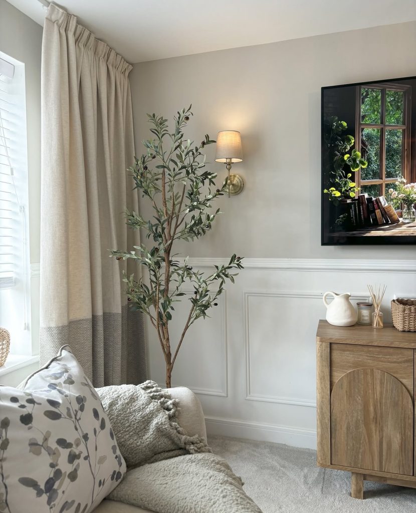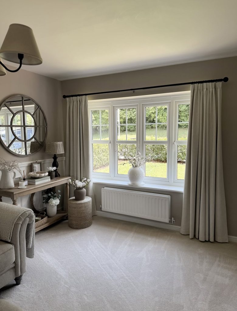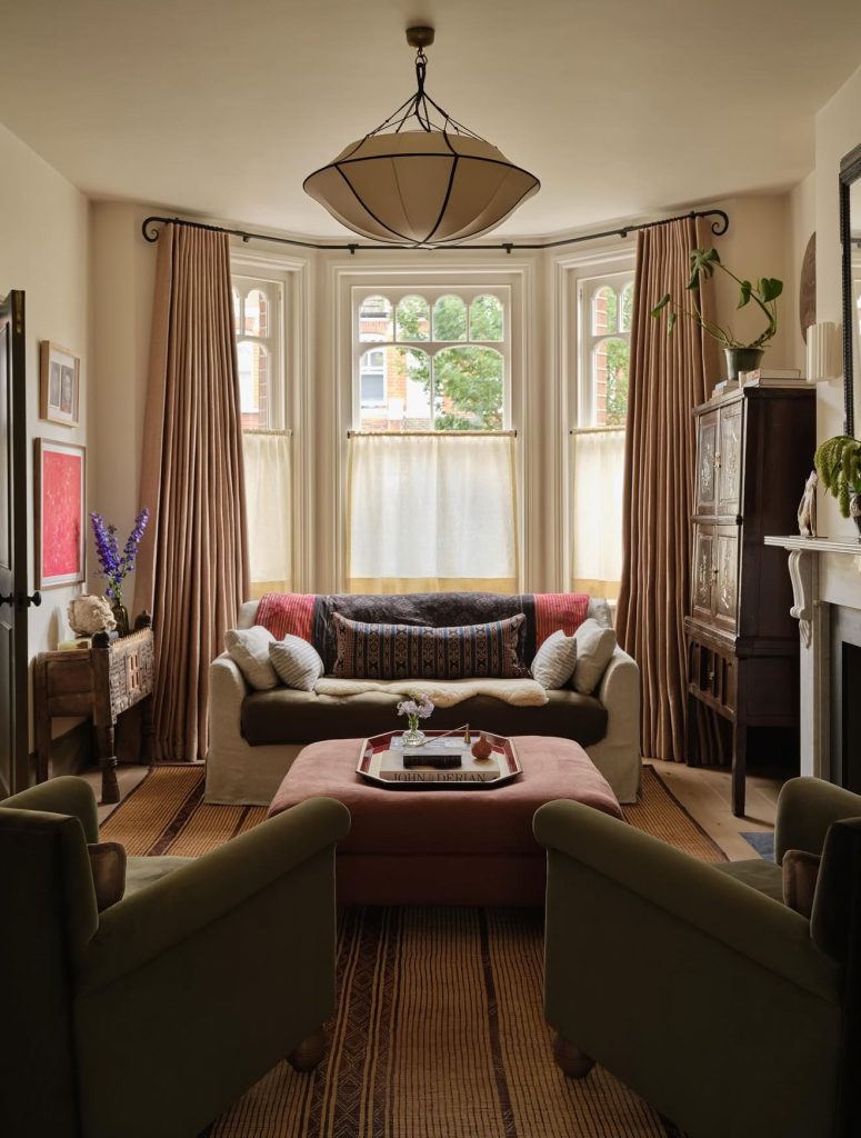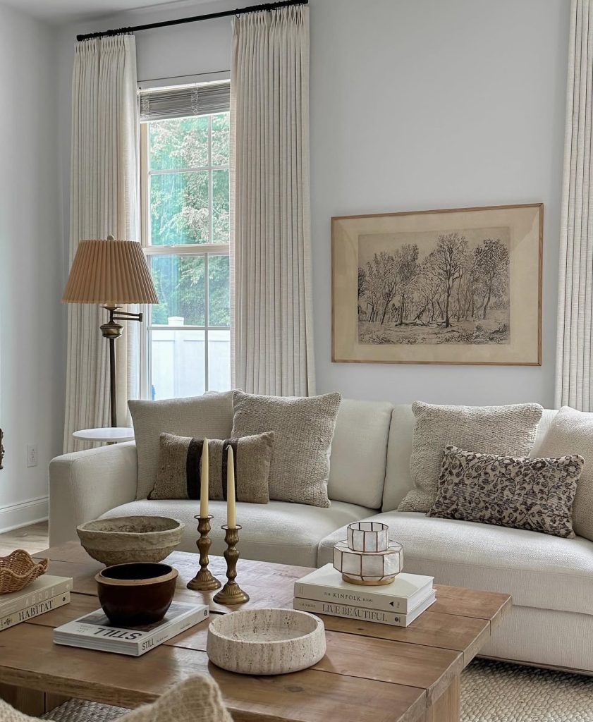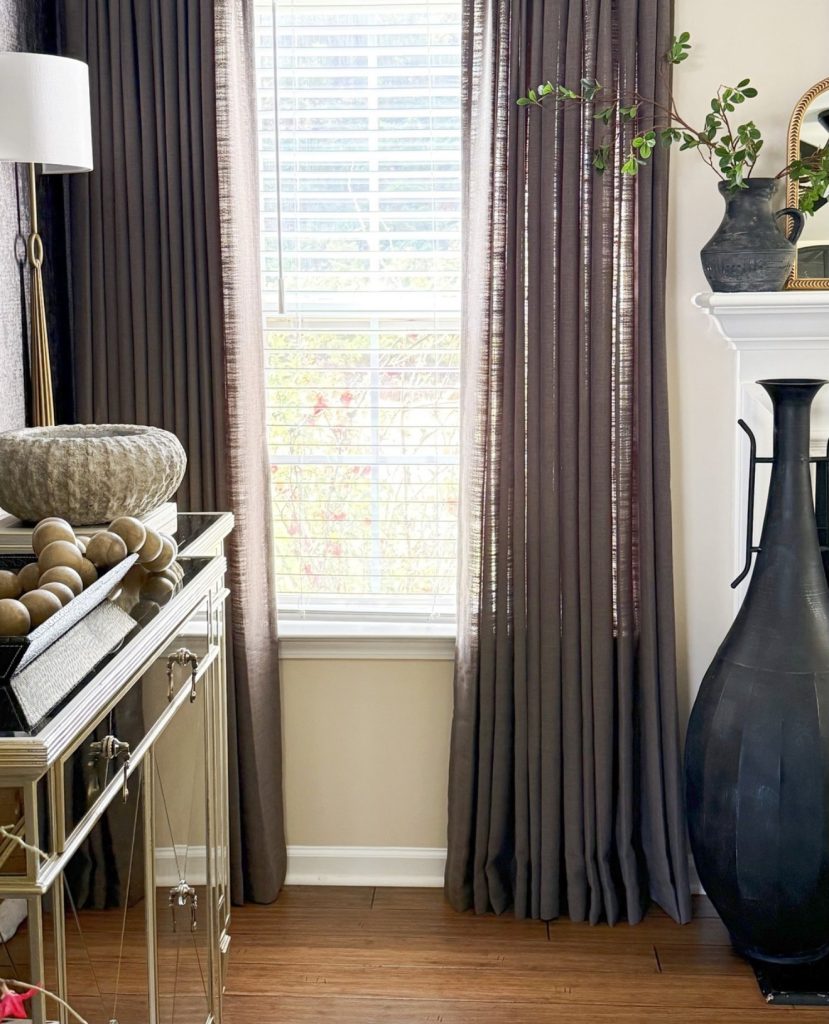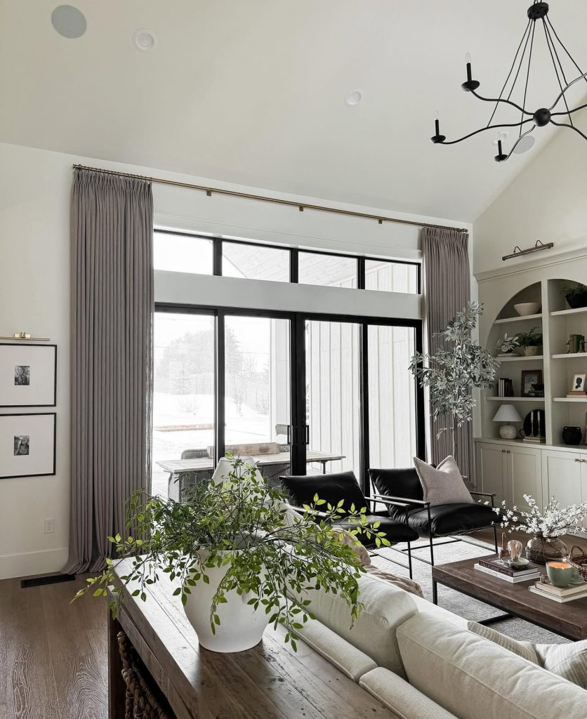 Two-tone curtains in gray and cream with a brown border on the sides soften the living room with depth in interior design suited for homes with a high window frame, providing an illusion of higher surroundings with its long fall, thus making the room more luxurious yet optimized for coziness with a mix between wood and greens in a style that fits farmhouse interior design with a twist in the 2026 trend for homes with any interior inspiration for interior design in homes.