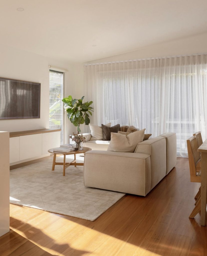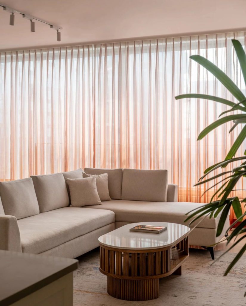 In this interior design concept, sheer white curtains made from natural linen adorn the entire window in the living room with a soothing effect on the room’s interior, tied to the living room’s light brown couch with brown wood floors in 2026 interior design concepts characterized by minimalist ideas for interior design.