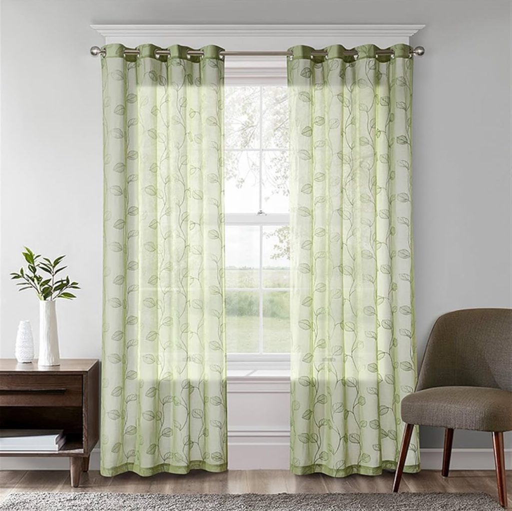 Light green lace curtains with delicate floral embroidery introduce a refreshing farmhouse and French country touch. This look is part of the 2026 trend toward cheerful, colorful textiles that connect the indoors with nature. The semi-transparent weave softly diffuses daylight, ideal for rustic or Indian-style modern homes. To achieve a similar vibe, choose lightweight materials that sway easily with the breeze—creating a calm, organic rhythm throughout your window space.