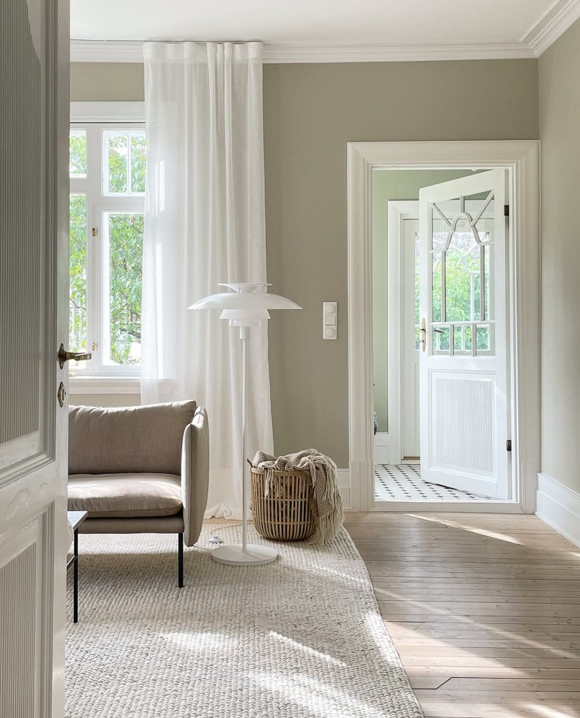 Soft white sheer curtains bring romantic brightness to this French country-inspired corner. The layered drapes complement muted walls and warm wooden floors, creating a tranquil setting filled with natural light. Their long length elongates the room, emphasizing its high-ceiling charm. The textured basket and subtle earthy tones introduce a rustic edge that feels cozy yet modern. This 2026 trend celebrates spaces that combine practicality with poetry—inviting sunlight to dance through gentle fabric waves.