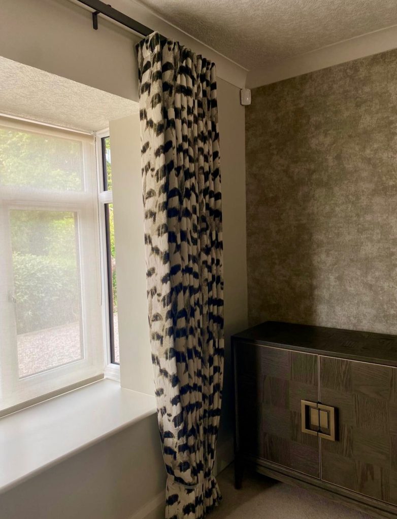 A bold statement piece for modern interiors, these patterned curtains turn a simple bay window into a striking focal point. The graphic print, featuring dark blue and neutral tones, injects colorful personality while maintaining elegance. Designers love this stylish look for compact spaces—it adds visual texture without overpowering the room. The linen-blend material brings warmth, while the short inner sheer layer keeps daylight soft and natural. A perfect 2026 trend choice for homeowners who want energy and sophistication in one gesture.