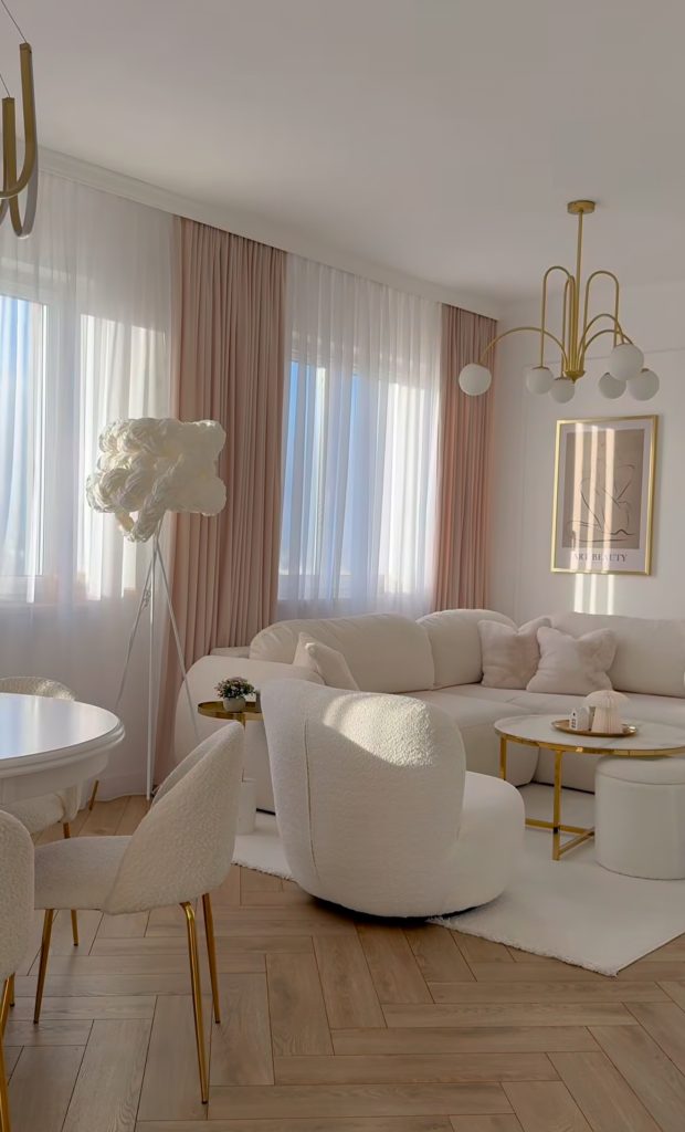 Delicate white and pink layered curtains define this dreamy modern living room, infusing a sense of serenity and luxury. The double curtain setup—sheer and solid—balances natural light and privacy beautifully. Soft gold accents and plush textures enhance the aesthetic harmony, making this one of the most elegant ideas for 2026 interiors. The look captures the rise of feminine minimalism, where cream, blush, and ivory tones create a peaceful yet sophisticated vibe.