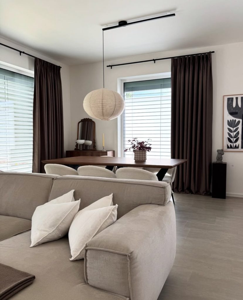 Deep brown drapes add dramatic contrast to a luxury living room anchored by neutral tones. The long curtains with a subtle sheen embody classic elegance with a modern edge. Perfect for high-ceiling homes, this style instantly enriches interiors by framing the window as a centerpiece. The layered effect—light sheers underneath—reflects a double-curtain approach trending strongly into 2026. It’s bold, timeless, and ideal for homeowners craving depth and intimacy without overpowering the room’s natural light.