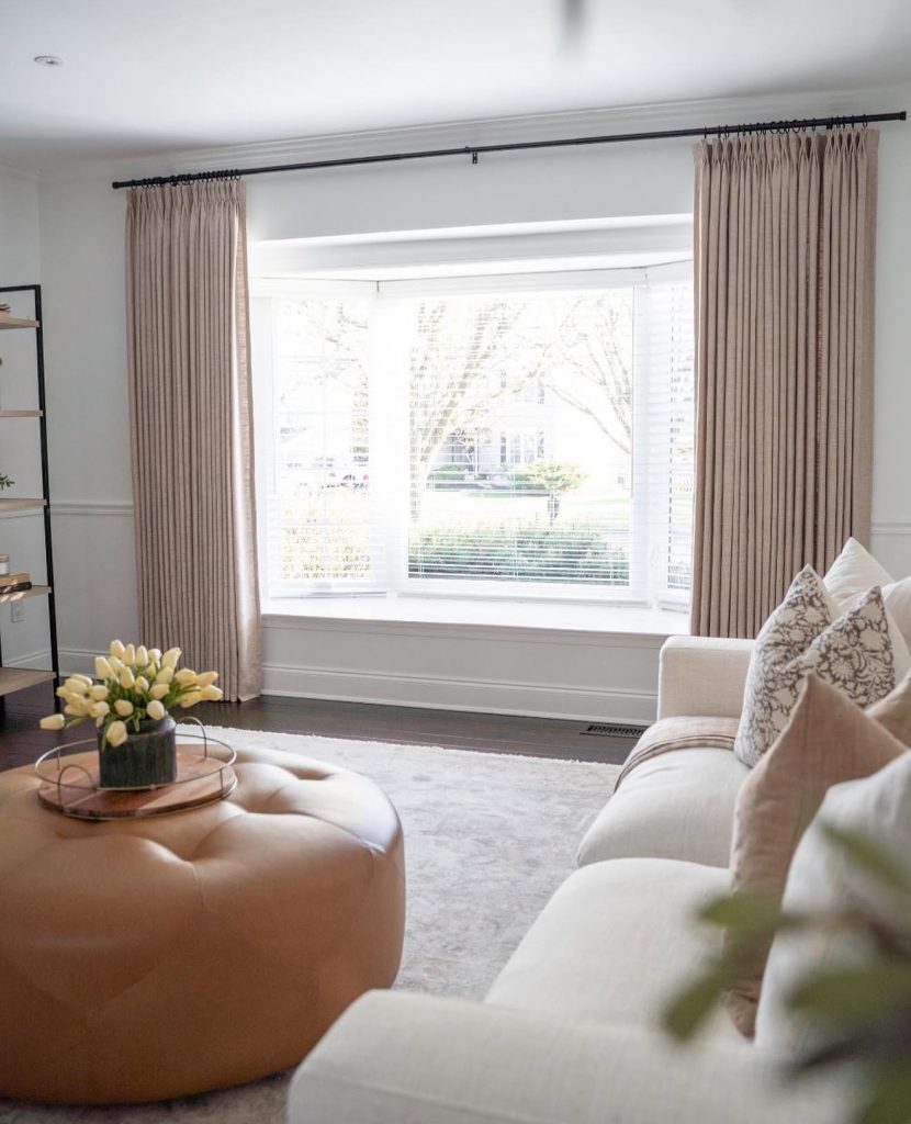 Beige curtains with a neutral tone fit the bay window frame perfectly, thus providing depth to the living room area. The simplicity in design combined with the long fall creates a luxury feel optimized by throw pillows and a tufted ottoman. The mix between brown leather and cream-colored textiles creates an aesthetically pleasing contrast between the two extremes. Higher placement on the wall creates an illusion of higher ceilings, thus providing more comfort even in smaller rooms optimized by timeless interior design with a twist for stylish ideas suited for any interior design inspiration for homes.