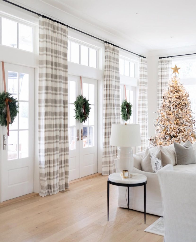 Beige curtains with stripes in cream, gray, and brown hues enhance the living room with a playful style optimized by the presence of double doors that appear more luxurious with the high panels drawing attention to the high ceiling in the room enhanced by the Christmas tree decorated with greens for the festive holiday spirit. The mix between different hues creates a colorful touch without looking overwhelming, thus sticking to a clean minimalist design that creates style for any room in 2026 interior design trends optimized for timelessness with a twist suited for homes with any interior design inspiration.