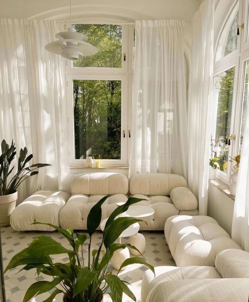 White sheer curtains adorn the bright window in the living room, spreading their brightness in the room’s interior for enhanced lightness in the living room. The sheer curtains feature a long, flowing design, exuding an improved look associated with a modern living room, characterized by a casual look and feel associated with nature in the living room’s decorative ideas with leafy greens in 2026 interior design ideas for sheer fabrics in living rooms.