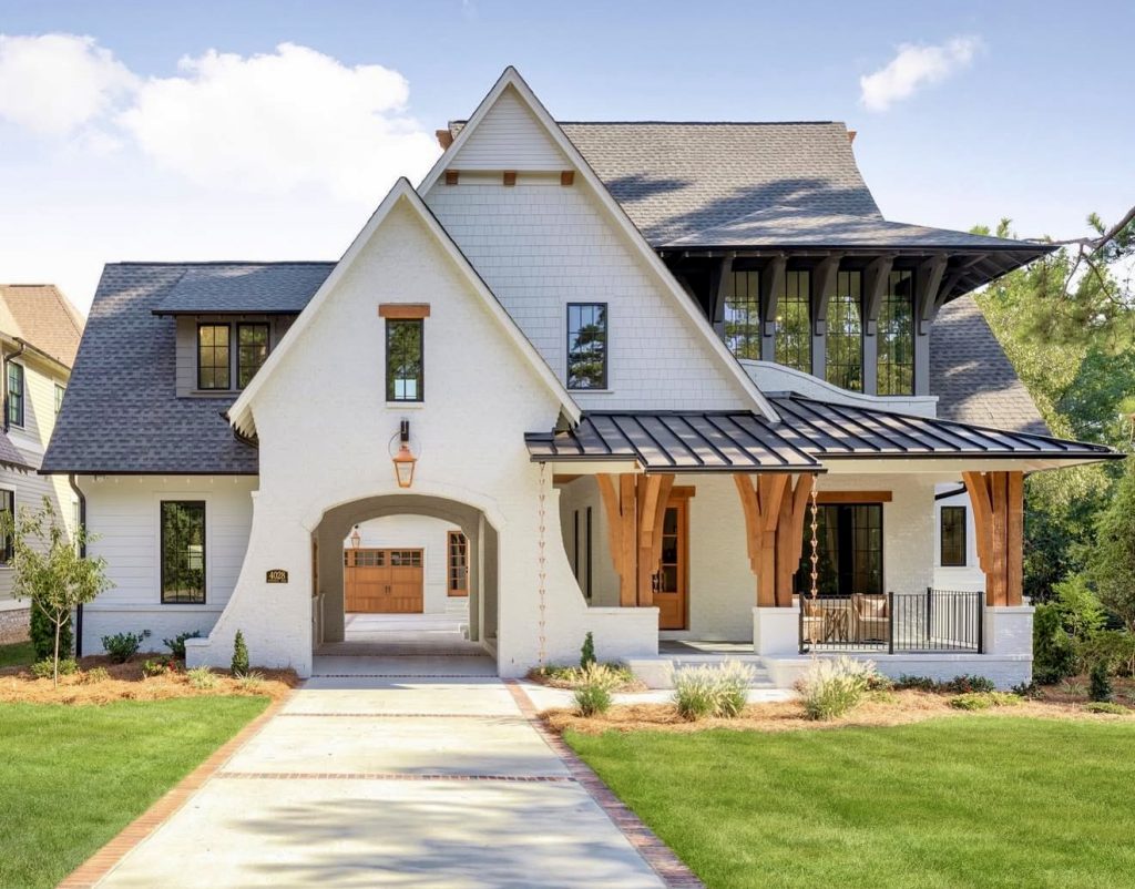 This design is a masterclass in combinations—white-painted brick paired with exposed wood beams in a rich dark brown. The contrast strikes a chord between modern farmhouse warmth and traditional elegance. The black roof and window trim add a sharp definition, highlighting the architectural lines. With stone accents around the entry, the overall look blends rustic charm with sophistication, reflecting a major 2026 trend: homes that balance minimalism with natural materials. This palette shows that neutrals don’t have to feel cold; when paired thoughtfully with brown and wood details, they exude warmth and character.