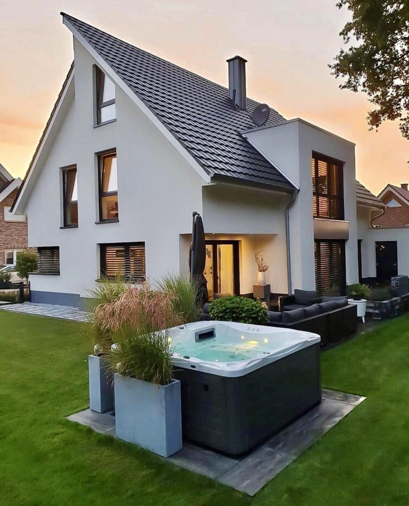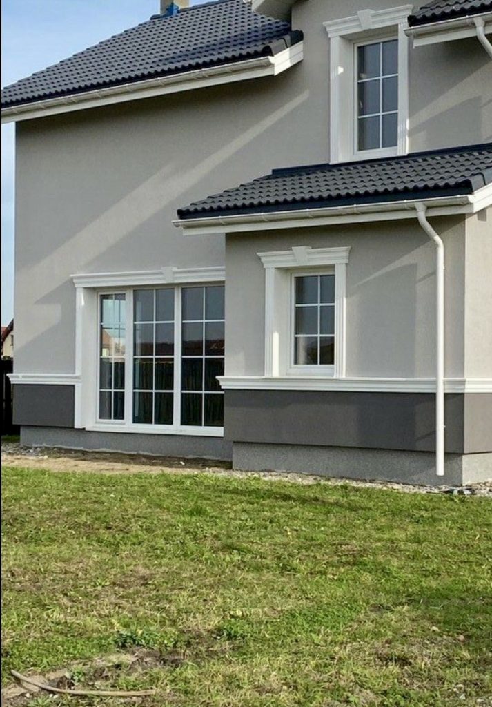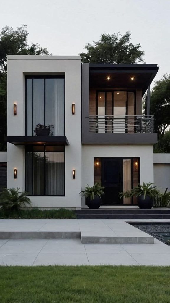 This sleek modern home shows how grey tones can feel both sophisticated and calming. The smooth facade combines a light neutral upper section with a darker gray base, creating subtle contrast without overwhelming the design. In 2026 trends, this type of two-tone exterior is gaining popularity for contemporary builds, offering visual interest through shade variation rather than ornate details. Pairing grey with black accents on windows and rooflines gives the home a polished look, while still allowing flexibility for landscaping choices. It’s an ideal palette for homeowners who love minimalist design but want warmth, not sterility.