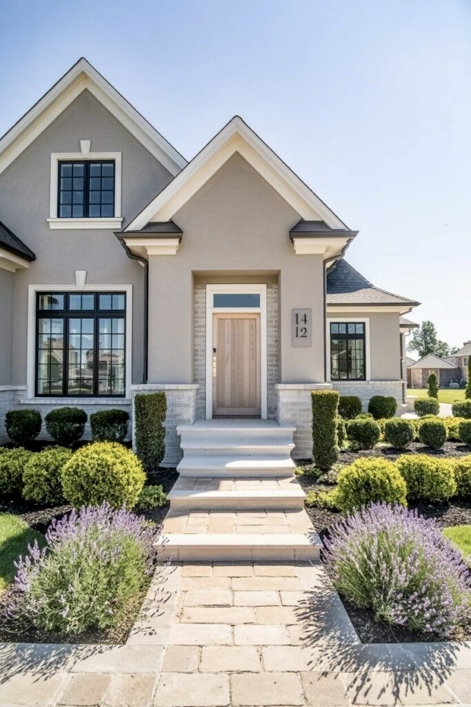 This home embraces the versatility of greige, a shade sitting between beige and gray, making it one of the most requested palettes for 2026. The muted backdrop highlights the black-framed windows and pale wooden front door, offering a clean yet welcoming aesthetic. Subtle stone accents around the entryway deepen the texture, proving how combinations of materials bring a neutral palette to life. Designers recommend greige for those who want a flexible base color that works equally well with traditional or modern architecture, making it a go-to for resale value as well.