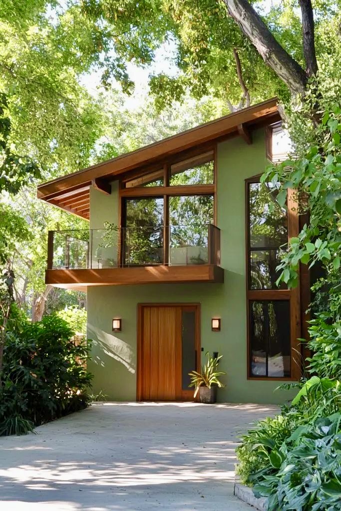 Nature-inspired palettes are flourishing in 2026, and olive green is at the forefront. This home’s exterior blends effortlessly into its wooded surroundings, creating a serene retreat vibe. The warm wood trim and natural lines highlight the richness of green as an earth tone, reinforcing a connection with the environment. This palette resonates strongly with those who prefer eco-friendly design philosophies, as it mirrors natural landscapes instead of contrasting them. In fact, influencers in sustainable living emphasize how shades like olive and sage green provide a grounded, timeless look while also aligning with environmentally conscious values.