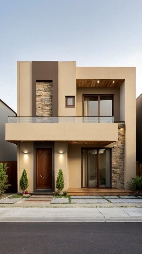 Here we see a bold, geometric home design that fuses smooth beige siding with rugged stone insets. This 2026 trend is all about balance—pairing sleek modern architecture with earthy textures. The contrast between warm brown details and creamy panels prevents the palette from feeling flat, while clean lines ensure a contemporary edge. This combination appeals to younger homeowners who want exteriors that look both cutting-edge and timeless. Beige may once have been considered “safe,” but with the right stone accents, it now reads as sophisticated and chic.