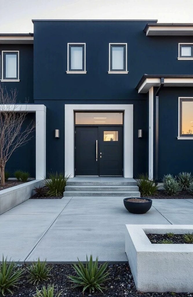 This home confirms how dark blue can look both commanding and elegant when combined with clean, modern architecture. The crisp white framing sets off the dramatic color, whereas a smooth concrete pathway weighs in on the sleek design. As one of the strongest trends of 2026, deep blue gray exterior finishes are highly favored for their adaptability; this color is equally successful in inner-city neighborhoods and coastal environments. It is a moody yet meditative shade of confident approachability. If resale is an intention, this unconditional color stands out and will catch the heartbeat of any design-conscious buyer.