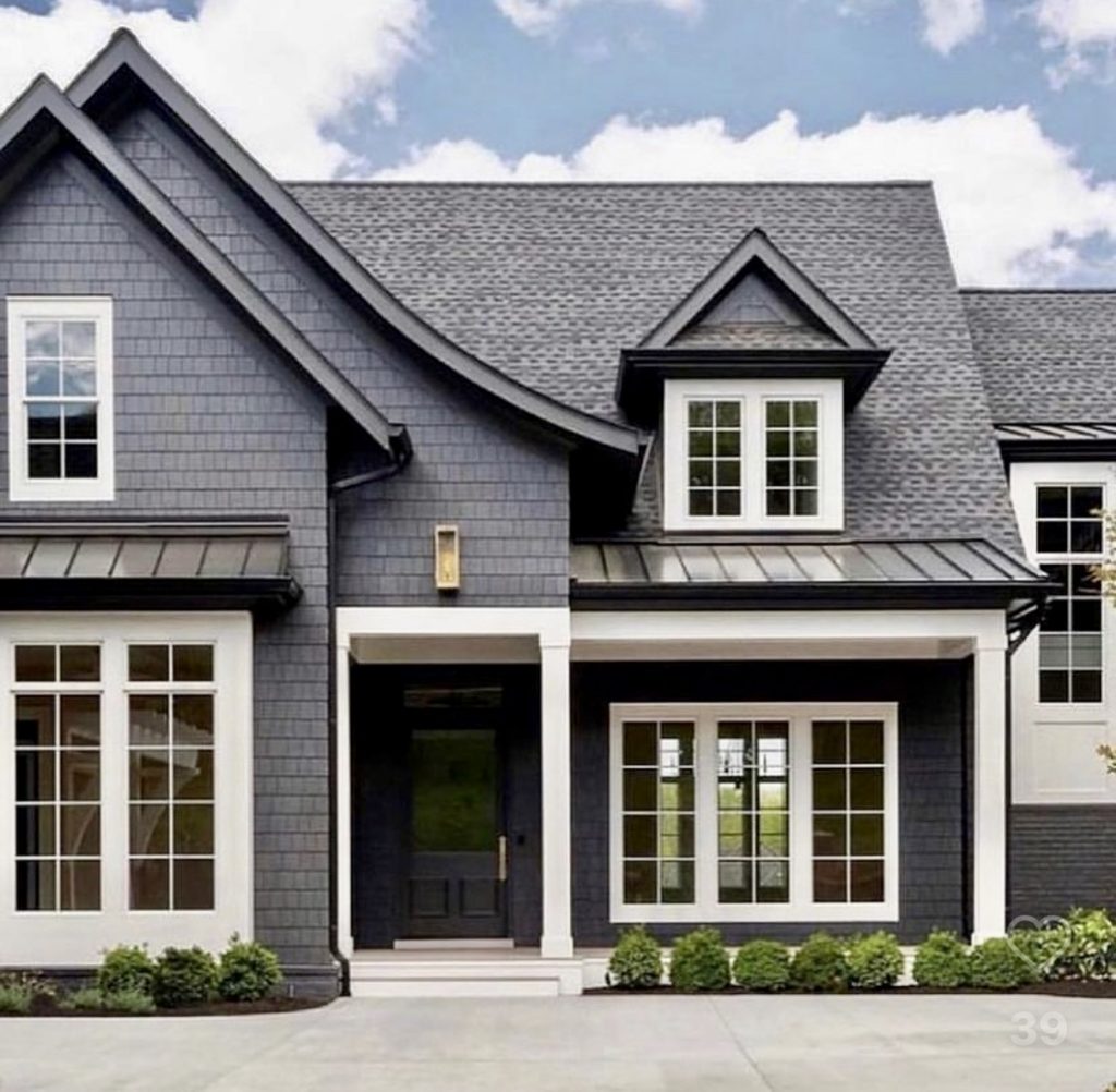 Deep blue gray continues to dominate modern builds, offering a sleek yet timeless look. The dark blue undertones create a moody atmosphere, while the white trim keeps the exterior sharp and balanced. This color choice has become one of the most desirable 2026 palettes for large family homes because it conveys sophistication without appearing too stark. Paired with clean architectural lines and tall windows, blue grey siding can also be accented with brushed brass fixtures for warmth. Influential design platforms like Architectural Digest have predicted that blue gray combinations will remain among the top picks well into the next decade.