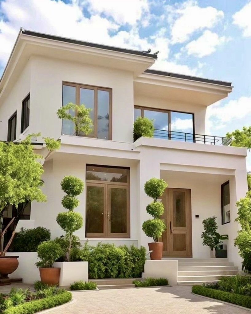 And rightly so, white has remained the perennial choice for exteriors. This design embodies how cream and white tones feel fresh and timeless when in company with warm wood accents. The soft neutral backdrop grants space to the greenery and landscaping, while the wooden front door summons warmth in return. White is never set in contrast to modern minimalism these days; quite the opposite, it reflects natural light well, building an airy curb appeal. For anyone uneasy with color, here is another incentive for why neutrals will always be in fashion.