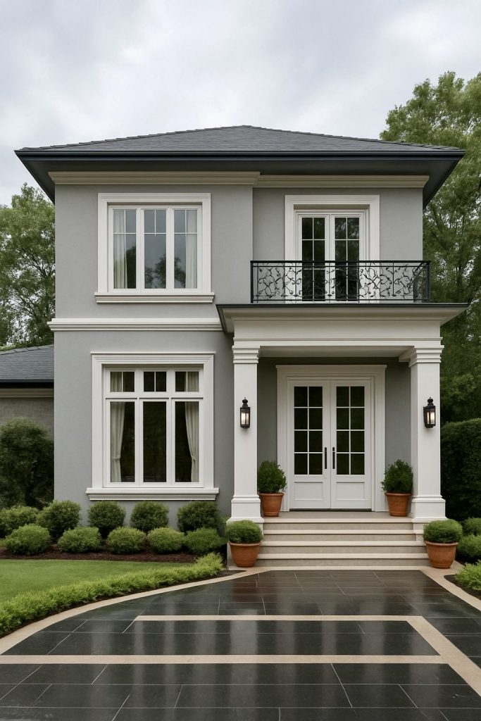 This one exudes strength and class with gray sets against white trim. The façade stands stately on the refined balance; its wrought-iron balcony detail elevates the design further. Gray remains among the top trending colors of 2026 because of its flexible nature: it can be modern with sleek files or classic with traditional forms. The shade’s depth serves as an elegant scaffold for architectural details, giving the house presence without overwhelming their functions.