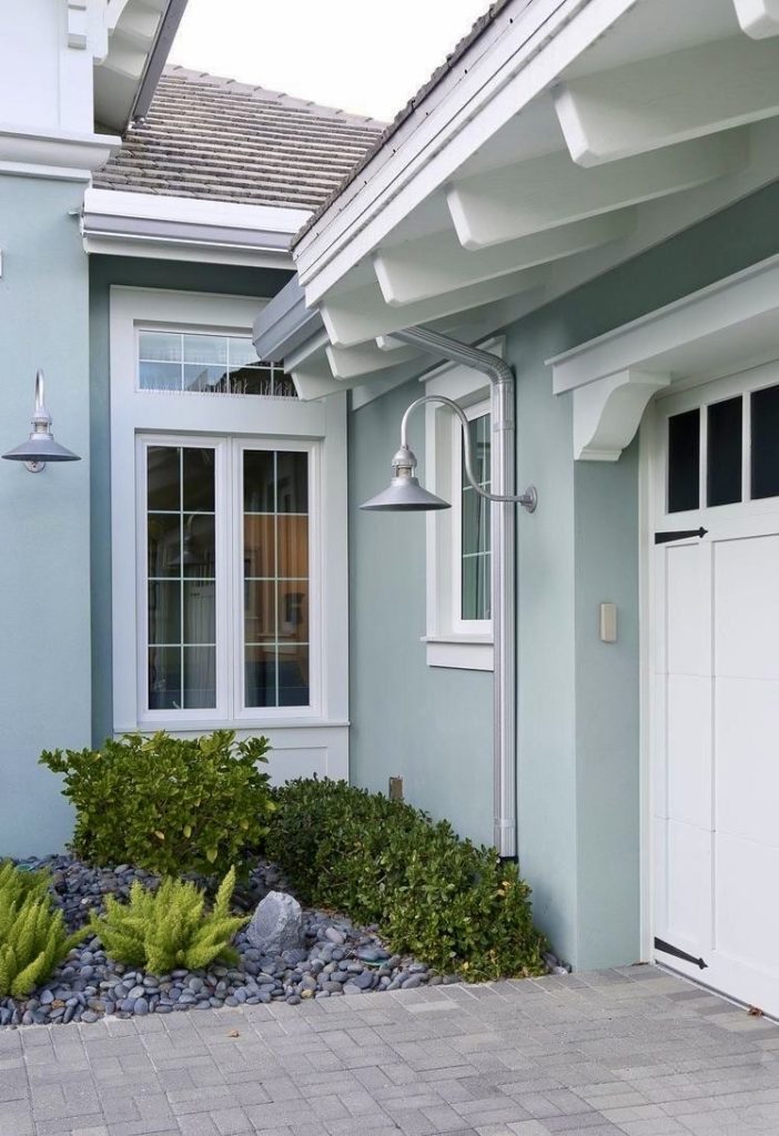 This house pushes a muted blue gray about an earth tone light undertone funny carpet that positions between freshness and subtlety. Coupled with a white trim and light stone landscaping, the effect is that the house feels vaguely coastal and maybe modern as well. Blue grey would be a recommendation these days by most designers for homeowners who want some personality without letting it dictate their exterior. It is a modern silhouette for the very calmness of seawater. One of very versatile, timeless, and stylish palettes for coastal or suburban residences.