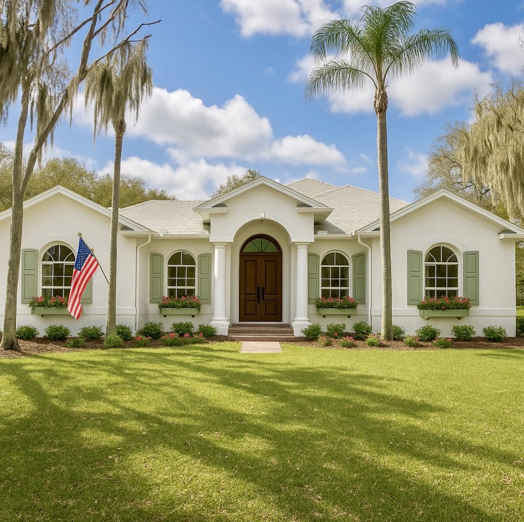 For those drawn to softer palettes, cream siding with muted green shutters creates a breezy, coastal feel. This look channels traditional Southern charm while staying perfectly aligned with 2026 preferences for light neutrals. The addition of lush flower boxes adds an earth tone accent, grounding the overall design. This palette works beautifully in sunny climates where white or beige might otherwise feel too stark. Influencers in home design note that lighter shades like cream and greige not only keep homes cooler in warmer regions but also provide a timeless canvas for seasonal decorating.