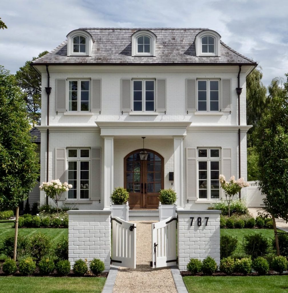 Few things are as timeless as a painted brick home, and in 2026, the pairing of white brick with greige shutters is setting the tone for elegant curb appeal. The mix of white and grey undertones adds depth, while the natural stone walkway ties everything together in a polished way. This kind of color story works in both suburban and urban neighborhoods, appealing to those who want classic style with a contemporary twist. When combined with natural wood doors, the palette avoids feeling too sterile, instead achieving a balance between traditional charm and modern sophistication.