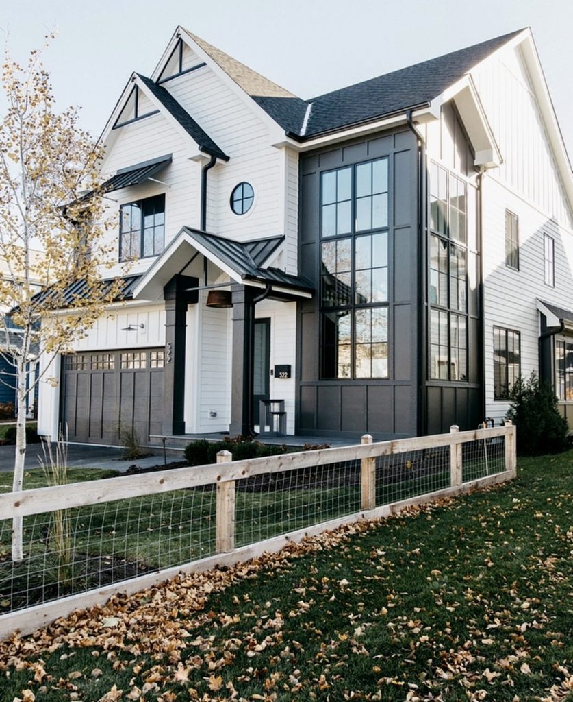 Few combinations are as striking as white siding paired with dark charcoal trim. This modern farmhouse-style exterior leans into the popularity of grey and black accents, giving crisp white siding a bold, updated edge. Large glass panels framed in deep dark gray provide a sense of openness and modernity, while the garage and front door tie in seamlessly with the trim. In terms of 2026 trends, designers highlight this look as perfect for those wanting to blend timeless appeal with contemporary detail. It’s also practical, as the white-and-dark pairing stays relevant across decades, balancing lightness with drama.