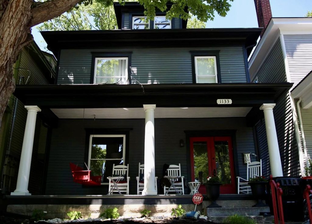For those drawn to more daring palettes, blue gray exteriors with moody undertones are a powerful choice. This historic-style home has been updated with dark siding that leans toward blue grey, accented by crisp white columns and a fiery red front door. The pop of red against the cool base color shows how bold combinations can elevate even traditional architecture. This approach is being celebrated in 2026 as younger homeowners look for ways to add personality without straying too far from classic curb appeal. The balance of heritage and modern flair makes this palette timeless yet expressive.
