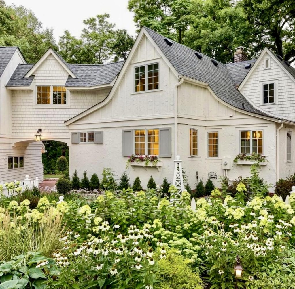 Warm neutrals are defining exterior palettes for 2026, and this home illustrates the charm of cream siding enhanced with soft greige shutters. The combination feels fresh and airy, yet it retains a grounded connection to earth tones. The layered textures of stucco, shingles, and wood detailing give this palette depth, proving that light shades don’t have to be boring. This design works particularly well in garden settings where greenery adds a natural frame to the soft palette. Style leaders note that greige is becoming one of the most versatile choices for exteriors because it balances gray coolness with beige warmth.