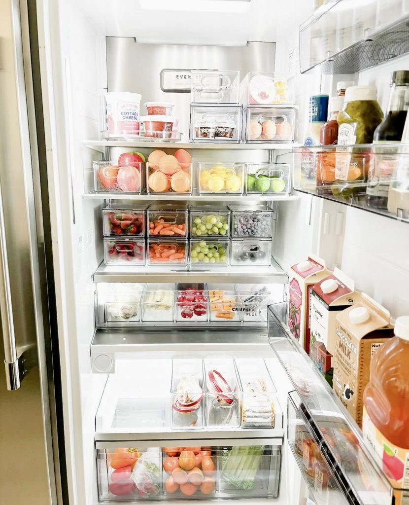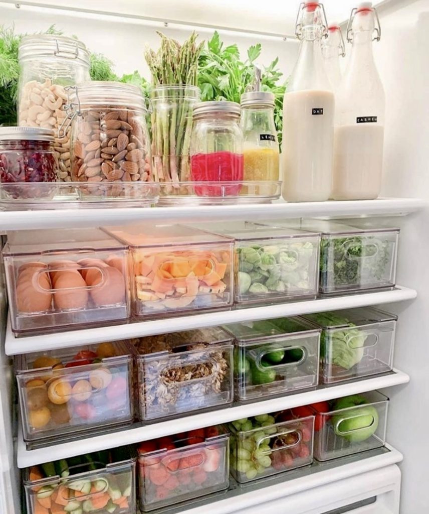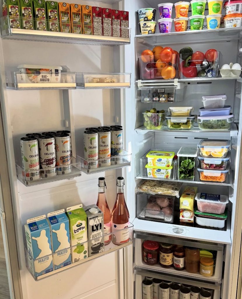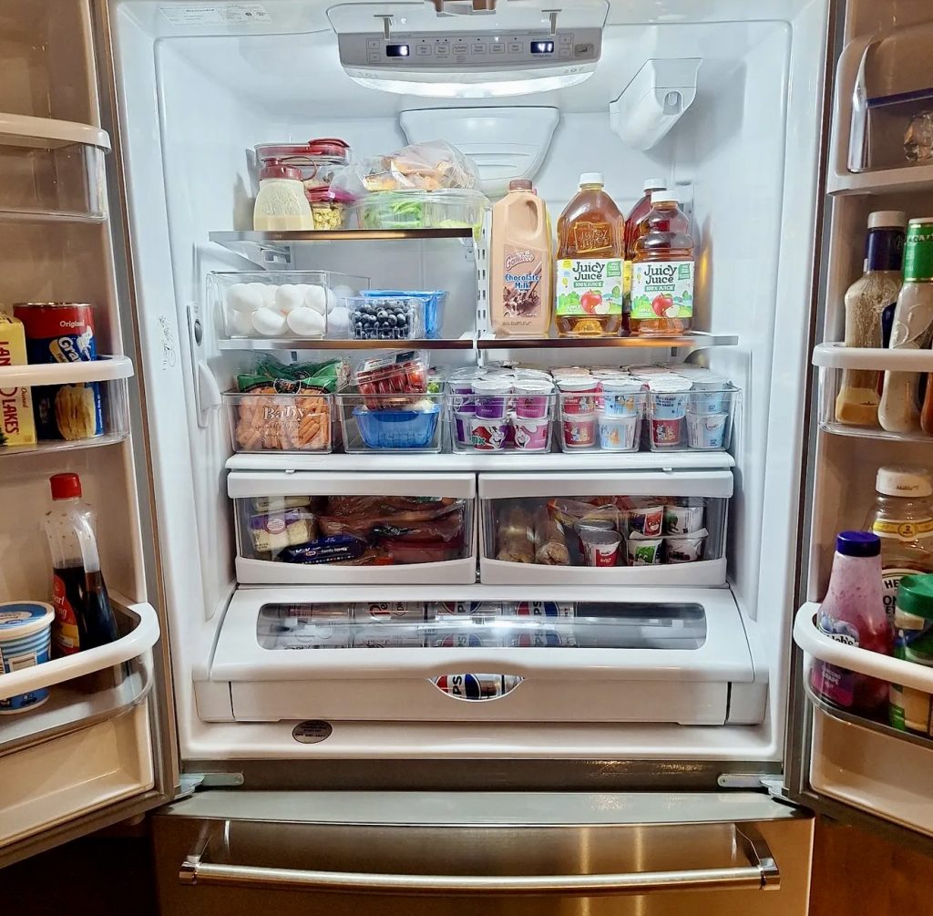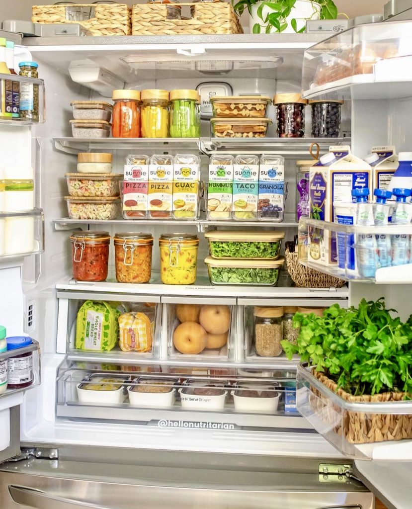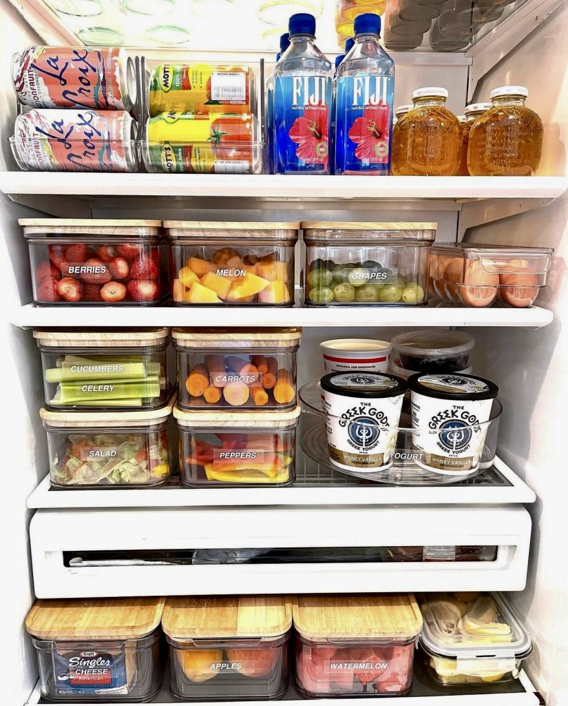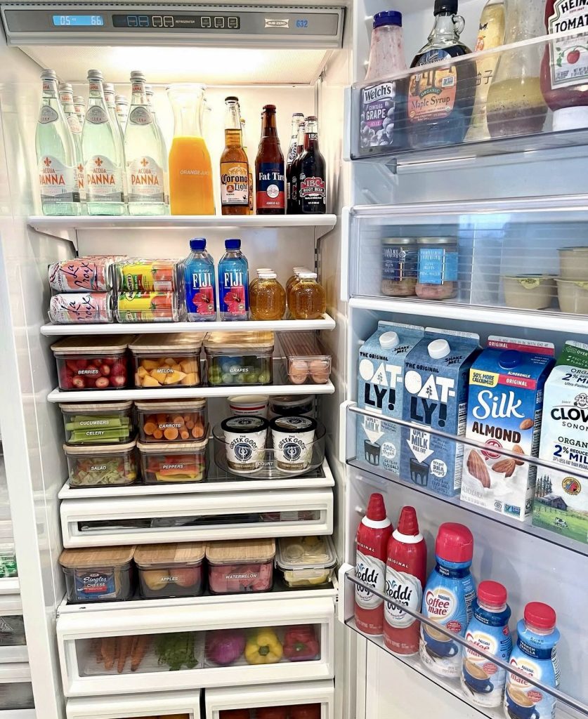 Color-coded and meticulously arranged, this vibrant fridge setup takes meal prep to an art form. Rows of glass containers hold chopped fruits, vegetables, and grains, turning everyday nutrition into an aesthetic statement. It’s the kind of organization that wellness influencers like @hellonutritarian have made mainstream—practical, healthy, and undeniably photogenic. Whether you use an IKEA container set or invest in a Samsung Bespoke French door model, this design proves that planning ahead saves both time and energy. It’s an organization that feels optimistic and inspiring every time you open the door.