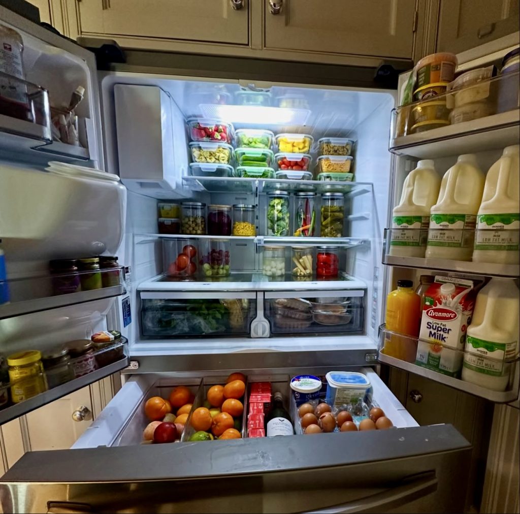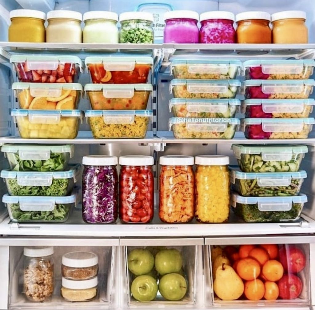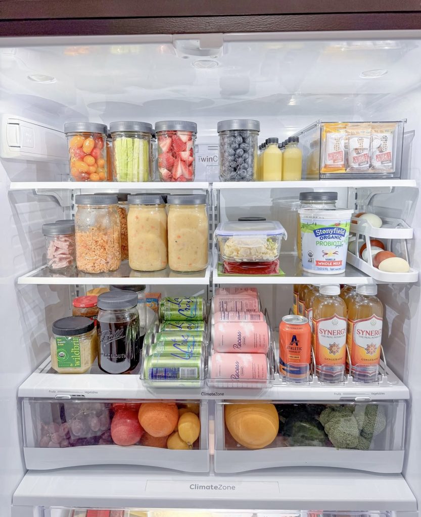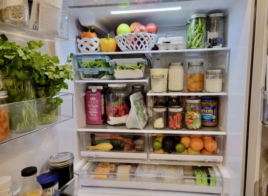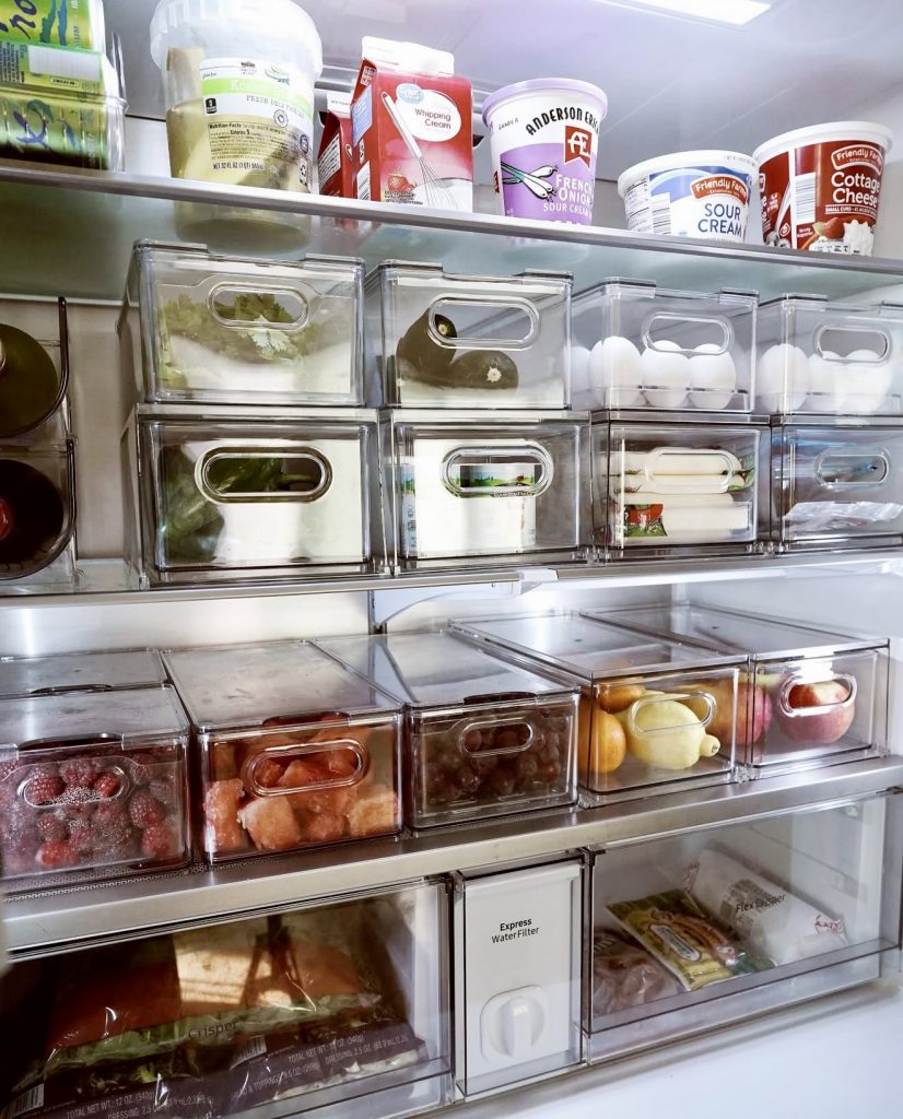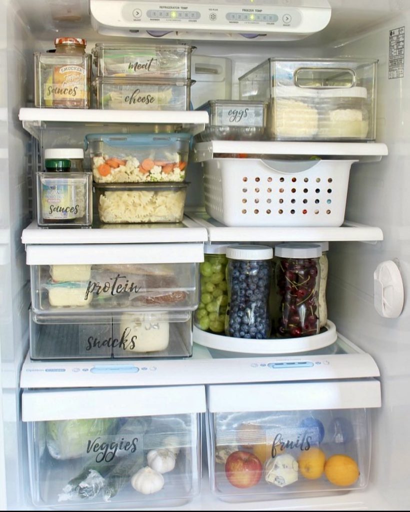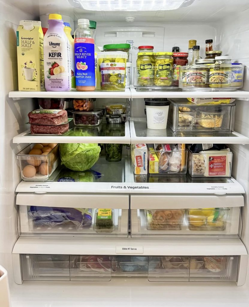 Color-coded and meticulously arranged, this vibrant fridge setup takes meal prep to an art form. Rows of glass containers hold chopped fruits, vegetables, and grains, turning everyday nutrition into an aesthetic statement. It’s the kind of organization that wellness influencers like @hellonutritarian have made mainstream—practical, healthy, and undeniably photogenic. Whether you use an IKEA container set or invest in a Samsung Bespoke French door model, this design proves that planning ahead saves both time and energy. It’s an organization that feels optimistic and inspiring every time you open the door.