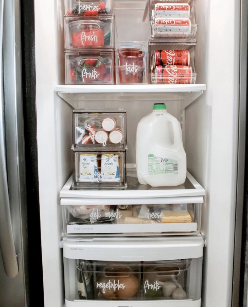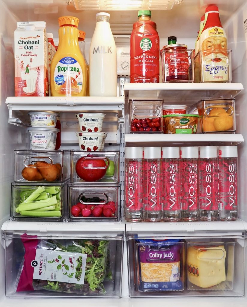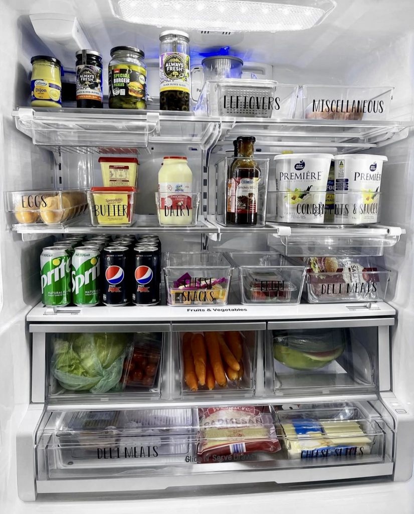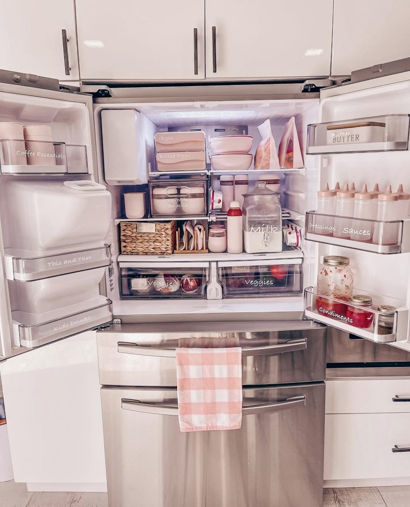This fridge makes organization intuitive—every bin is labeled from “Leftovers” to “Condiments & Sauces.” It’s a side-by-side design that turns chaos into calm with minimal effort. The uniform font and acrylic containers echo the aesthetic ideas popularized by The Home Edit and Kmart’s modular lines. Perfect for small refrigerators, it keeps beverages, produce, and snacks easy to find while maintaining a polished look. A balance of DIY effort and store-bought structure makes it as stylish as it is practical for 2026 living.