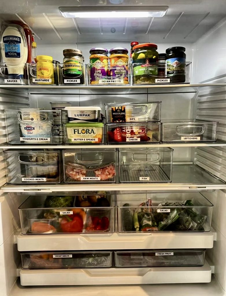 A lesson in simplicity, this layout shows how minimal organization can still feel warm and inviting. Condiments and sauces are lined neatly, while lower drawers separate veggies and proteins for easy access. The side-by-side storage method creates clear zones, making even busy mornings feel calm. Ideal for small refrigerators or dorm setups, it’s an example of DIY practicality that requires little investment—think dollar store containers and a touch of labeling. This “less-is-more” approach mirrors modern home trends celebrated by The Spruce and Good Housekeeping: clean, efficient, and refreshingly aesthetic.