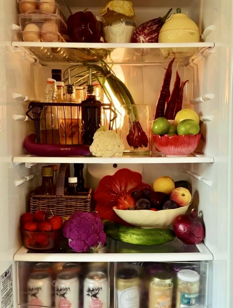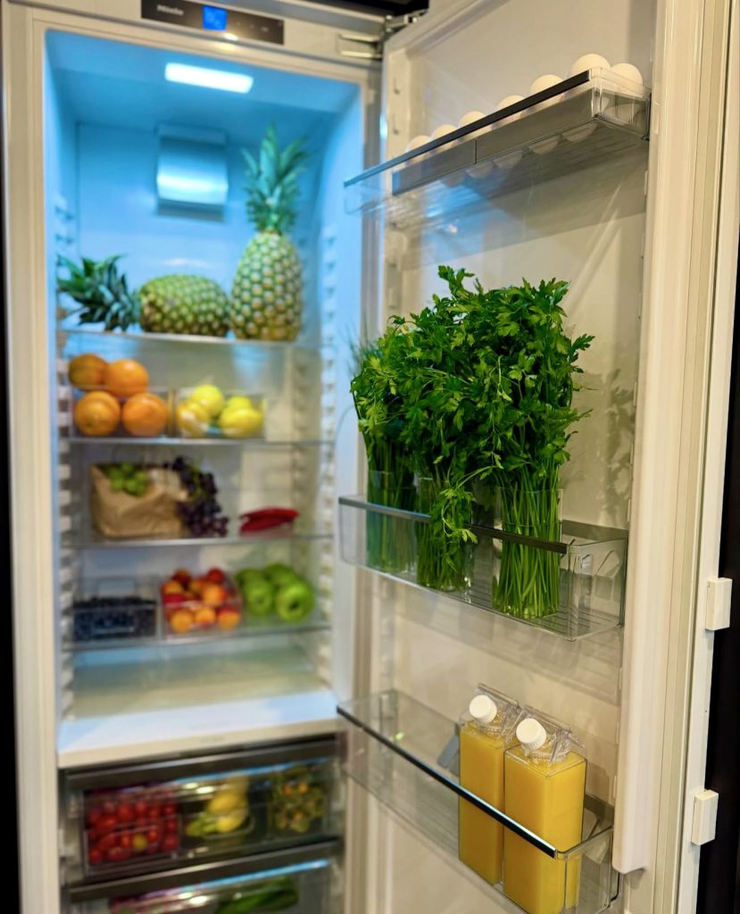 This setup feels like a breath of fresh air—literally. Bundles of herbs stand tall on the fridge door, while pineapples and citrus fruits rest neatly on glass shelves. It’s proof that inside every well-organized fridge is a little garden waiting to thrive. Perfect for those who shop local or practice DIY food prep, it reflects the clean modern aesthetic of Samsung and Miele French door designs. Keeping herbs in jars of water, a hack often shared on TikTok and by IKEA’s sustainability blog, extends freshness and adds a calming, aesthetic green glow to your kitchen routine.