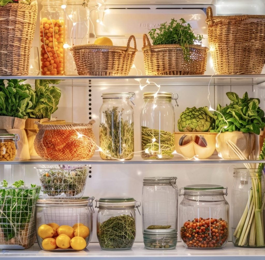 This final fridge setup feels almost artistic—a blend of earthy tones, fresh produce, and warm lighting. It channels a realistic, homey spirit often seen in IKEA catalogs and cozy lifestyle blogs. With its mix of veggies, drinks, and preserved items in baskets, it’s an ode to slow living and intentional design. A hint of DIY creativity—like reusing jars or arranging fruits in bowls—gives it a personal touch that’s deeply aesthetic and inviting. Perfect for those who see their fridge not just as storage, but as an expression of how they live and eat.