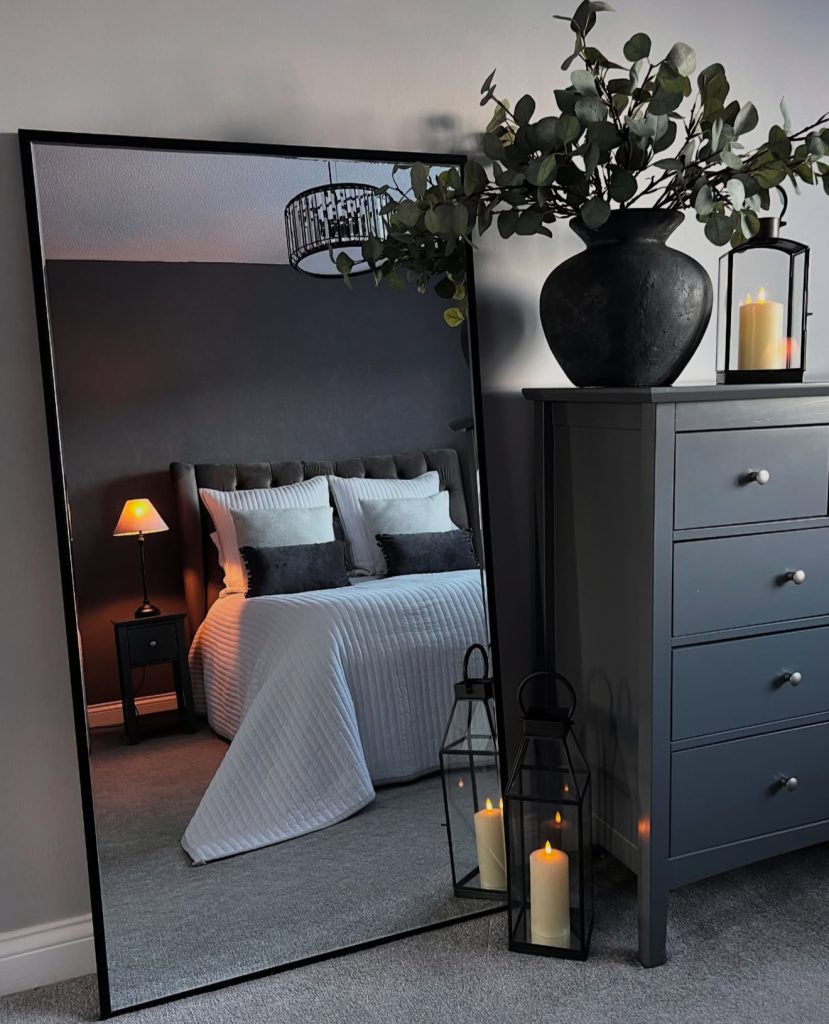 This room embraces a deep, moody palette that instantly creates an intimate and refined atmosphere rooted in charcoal tones. The oversized leaning mirror adds a modern aesthetic while doubling the sense of space, which is especially helpful in small rooms. Warm lantern candles and the single amber lamp bring in a subtle pop of color that softens the darker palette without interrupting the overall mood. Matte black accents ground the space and make it an ideal choice for men who prefer clean, structured styling. The combination of layered bedding and soft lighting adds an aesthetically cozy finish that makes the room feel luxurious yet approachable.