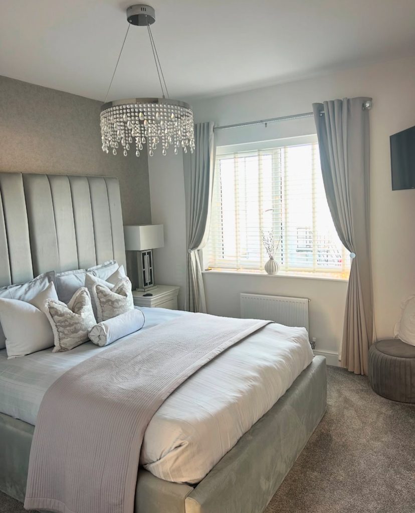 This design blends light grey upholstery with neutral bedding to create a soft, timeless look that feels effortlessly polished. The crystal chandelier adds a touch of luxury, balancing the simple color palette with glamorous sparkle. Gentle grey curtains frame the window beautifully, giving the room a cozy sense of enclosure. The subtle patterns and textures in the pillows keep the space visually interesting while staying within a calming grey range. This type of setup works particularly well for couples who want a refined, relaxing bedroom that feels both stylish and inviting.
