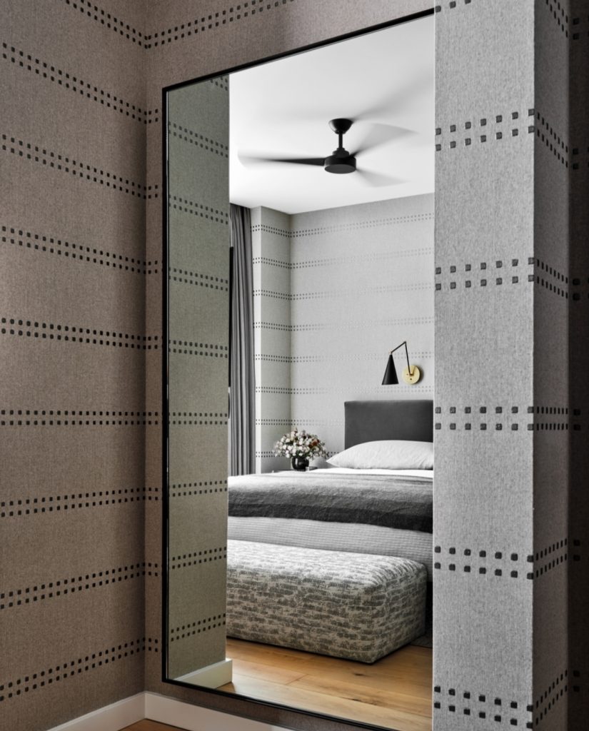 This charcoal and black, white, and beige bedroom redefines minimalist elegance. The geometric wallpaper offers texture and rhythm without overwhelming the small space, while a sleek black and brass wall sconce introduces a dash of modern sophistication. The soft bedding in layered greys makes the room aesthetic and grounded, ideal for men or anyone who enjoys structure and calm. The full-length mirror not only amplifies light but also visually doubles the depth of the room—a clever trick for small rooms. Interior experts like Studio McGee often emphasize the importance of layering neutral textures to keep grey bedrooms from feeling cold, and this design captures that perfectly.
