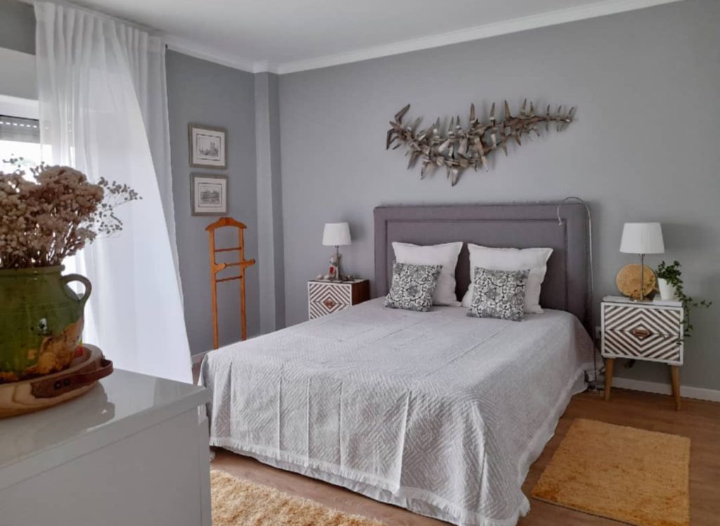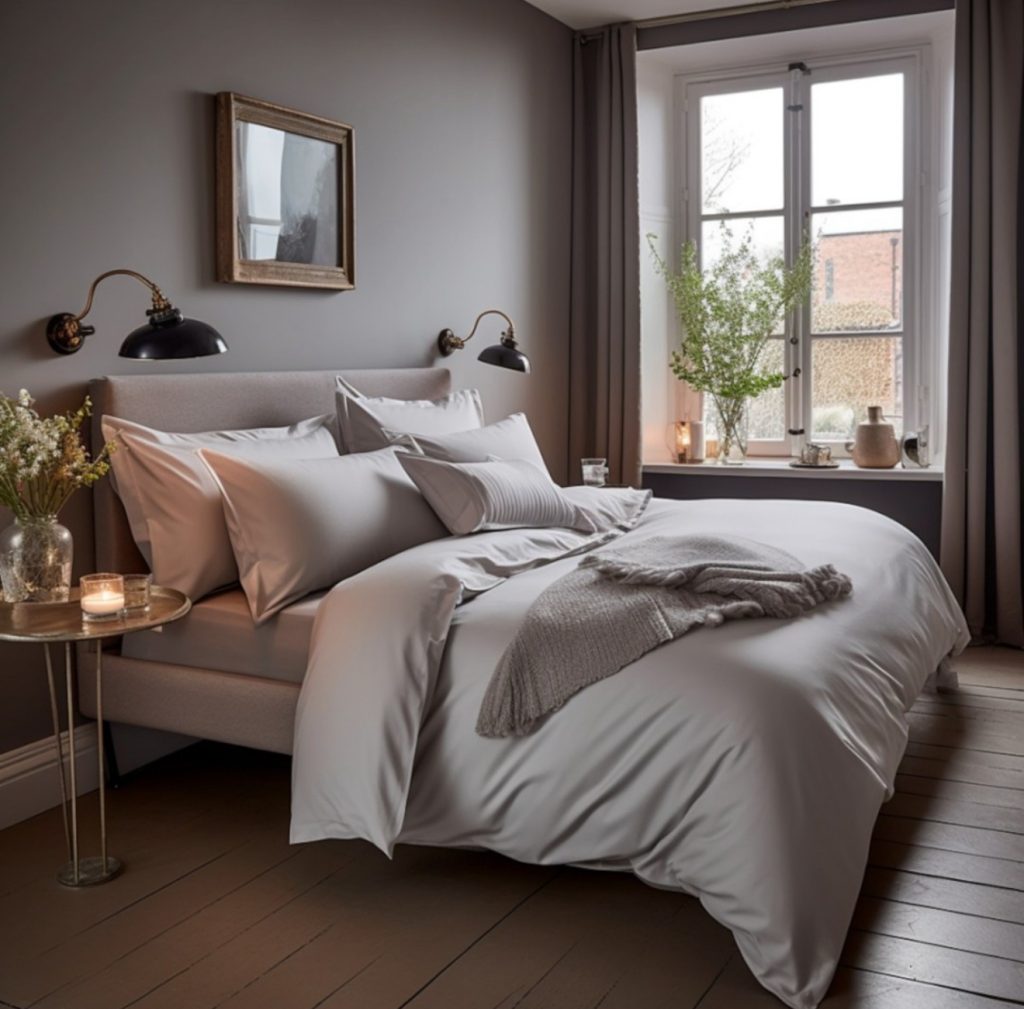 This bedroom radiates understated warmth through a light grey palette softened by beige undertones. Brass sconces flank the bed, adding an old-world glow that contrasts beautifully with the matte walls. Fresh greenery and candles infuse a cozy intimacy that makes the space ideal for couples seeking a tranquil haven. The natural light filtering through linen curtains enhances the sense of calm and simplicity—proof that grey decor doesn’t have to be sterile. Influenced by Scandinavian and modern farmhouse styles, this room highlights how muted tones and soft textures can turn even modest bedrooms into personal sanctuaries.