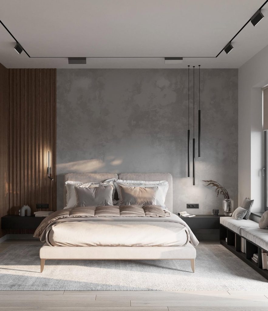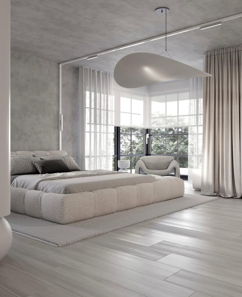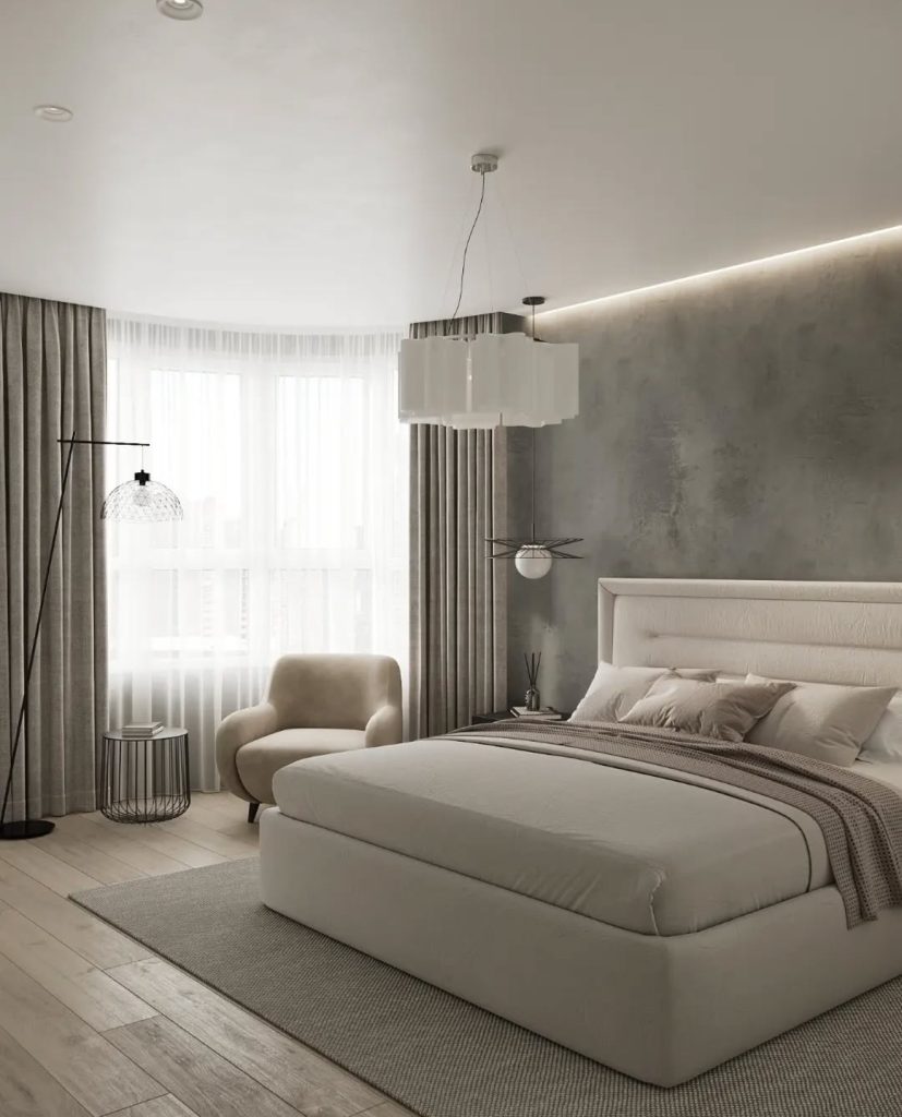 This striking grey bedroom celebrates modern minimalism through fluid shapes and airy light. The low-profile bed with soft edges grounds the space, while sculptural lighting adds an artistic statement. Pale wood floors and sheer curtains invite natural light to play across the surfaces, creating an atmosphere that feels for men aesthetic yet undeniably luxurious. The palette of cream and grey tones, subtly enriched with texture, delivers calm and refinement. Ideal for couples who appreciate serene modernism, this design mirrors the elegance seen in Elle Décor features on 2026 trends—where simplicity and texture define modern comfort.