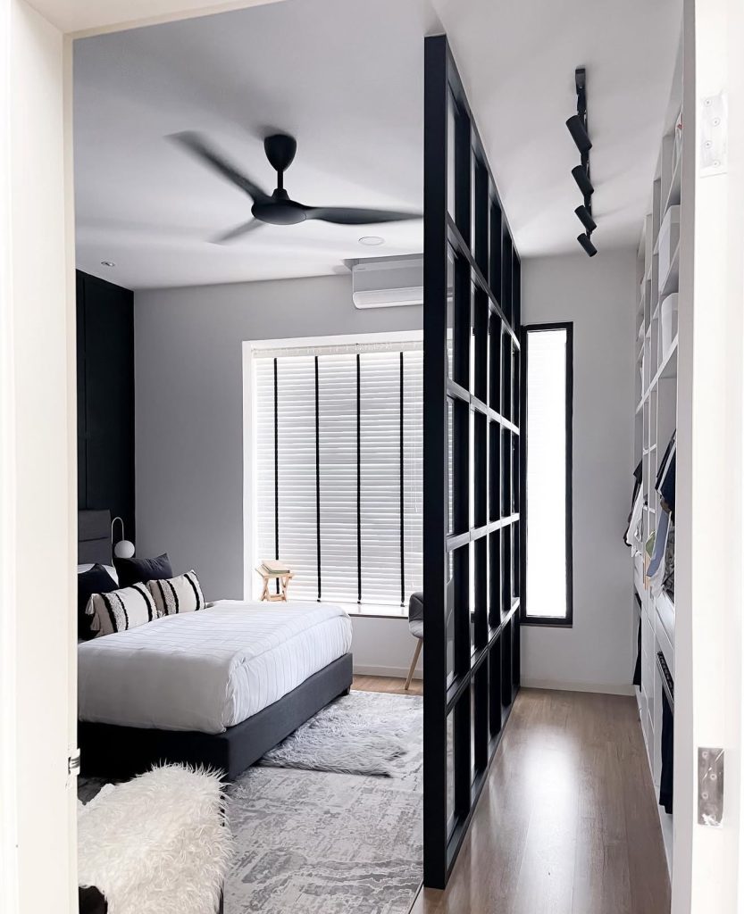 A striking black and white palette defines this sleek bedroom designed for practicality and style. The partition wall cleverly separates the sleeping zone from the wardrobe area, ideal for small rooms where every inch counts. This space balances monochrome drama with inviting textures—from the plush rug to the crisp white bedding. Perfect for a masculine aesthetic, the design uses linear contrast and minimalist fixtures to enhance depth and light. According to design experts at Dezeen, black architectural elements are making a comeback, especially when paired with soft light greys to create spatial flow and masculine elegance.