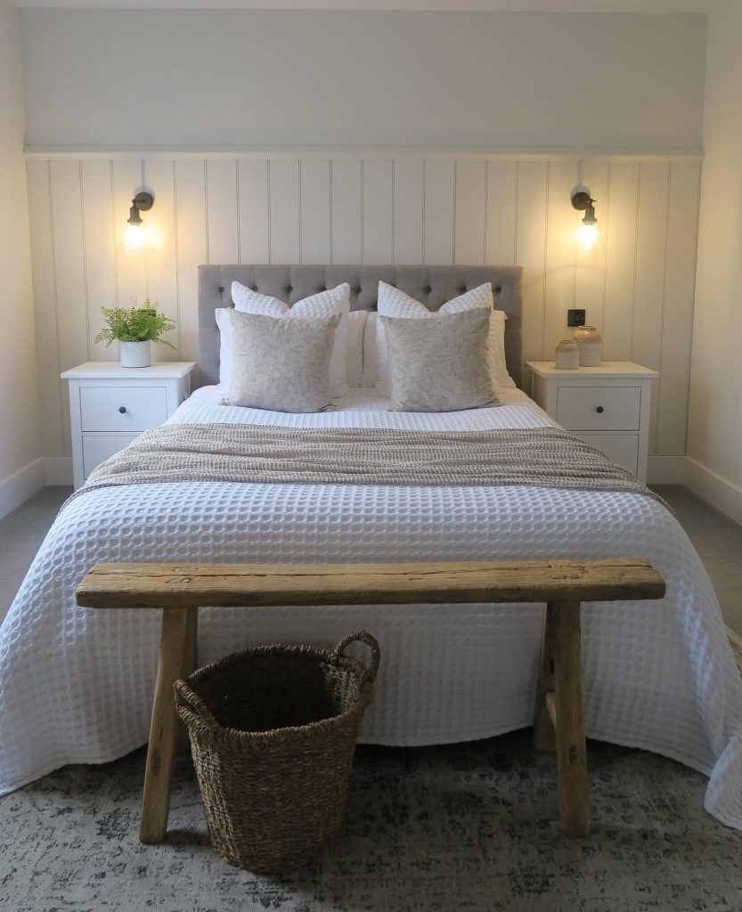 This bedroom leans into a gentle, welcoming palette that blends grey with beige and natural textures for a calm, grounded feel. The tufted headboard pairs beautifully with the soft textiles, creating an inviting look that works especially well for couples who want a shared, neutral space. Warm bedside lighting brings a delicate glow that enhances the room’s cozy atmosphere without overwhelming the subtle tones. The wooden bench and woven basket add an organic touch that feels timeless while introducing a quiet pop of color through warm wood hues. This setup is perfect for anyone seeking a serene retreat with a balanced, softly layered design that still feels modern.