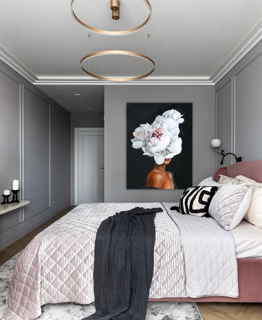 This pink and grey bedroom brings an unexpected yet stunning twist to the 2026 trend forecast. The blush headboard and quilted bedding add a feminine softness, while the black and white accents keep the look sharp and contemporary. A large floral artwork becomes the focal point, balancing romance with boldness—ideal for teenage girl rooms or for couples who want something modern yet emotional. The pop of color through muted pinks turns the space into a personalized statement of elegance. Interior stylists often highlight this black-pink fusion as the perfect balance between charm and confidence, making it a top pick in luxury decor this year.