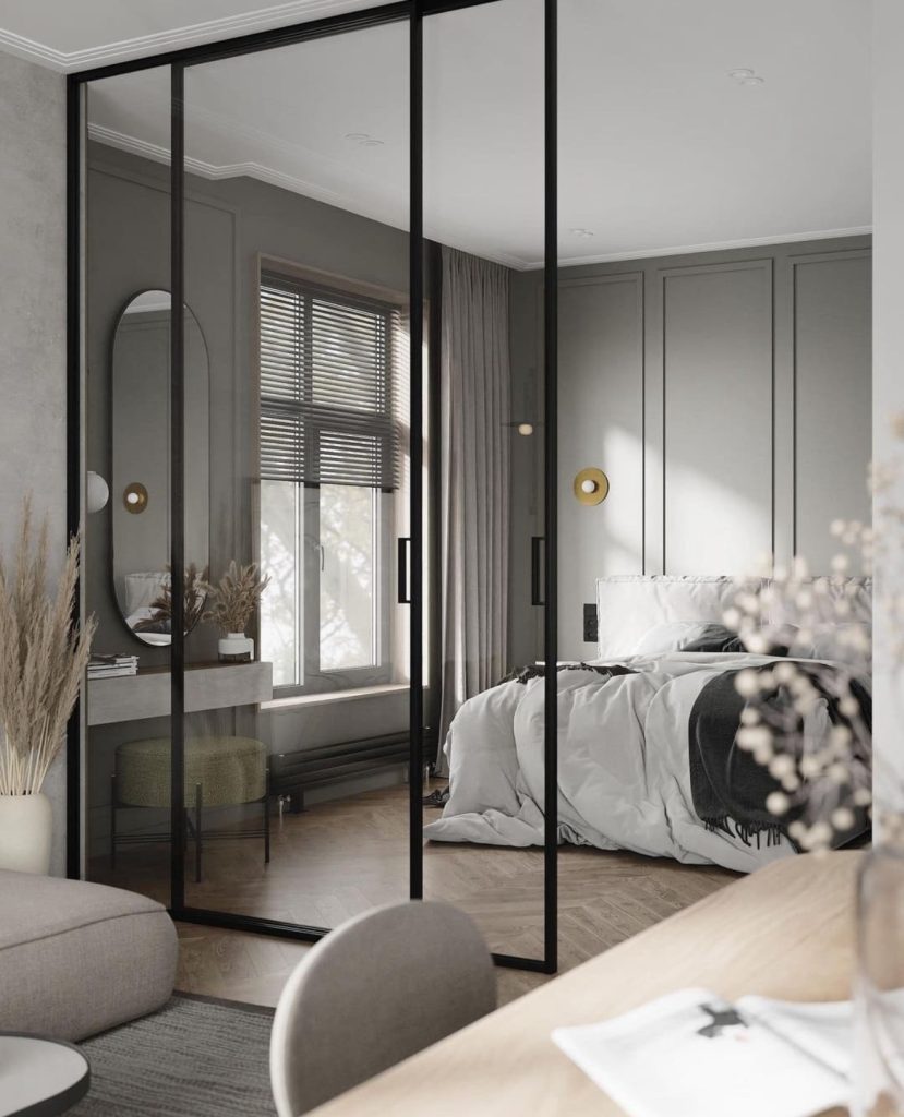 This modern grey decor idea merges function with style through reflective surfaces and layered textures. The mirrored wardrobe doors visually expand the room, while subtle black and metallic accents create balance. The result feels both airy and structured, ideal for men or anyone drawn to tailored minimalism. The white and grey bedding provides visual clarity, while soft natural light ensures a cozy yet sleek finish. This design demonstrates how smart contrast and texture can transform even compact small rooms into luxurious retreats.