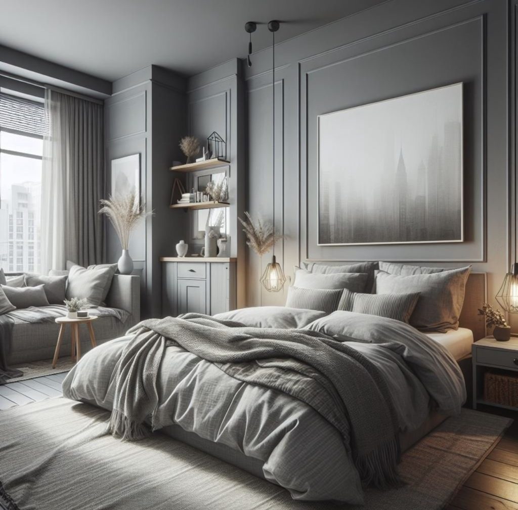 This space captures the essence of charcoal sophistication while maintaining a lived-in warmth. The paneled walls and layered bedding radiate comfort, and dried pampas grass accents introduce subtle brown and beige hues that soften the overall look. Perfect for couples or for men with an aesthetic, it’s a modern metropolitan design with heart. The lighting—warm and directional—enhances the room’s aesthetic cozy vibe, proving that grey doesn’t have to feel cold when styled with natural materials and soft illumination.
