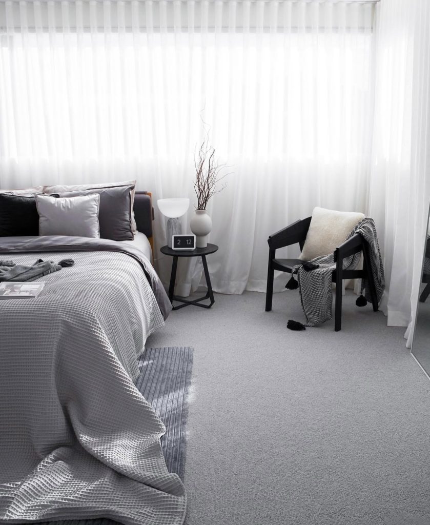 This light grey bedroom showcases minimalist purity with an understated pop of color in the darker furniture and decor elements. The monochrome palette creates calm, while plush textures ensure comfort. Perfect for small rooms, this style pairs black and white balance with abundant natural light, enhancing spaciousness. The neutral tones make it versatile—equally suited for men or for couples who appreciate clean, breathable design. Experts from Livingetc predict this aesthetic will dominate 2026 interiors, blending Scandinavian simplicity with quiet urban luxury.